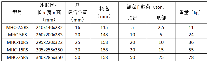 1、本系列產品目前共有五種規格:MHC-2.5RS、MHC-5RS、MHC-10RS、MHC-15RS、MHC-25RS。廣泛適用于機械設備、橋梁建筑、鐵路軌道等方面的安裝和維修;交通運輸的重物裝卸;汽車拖拉機修理等方面。